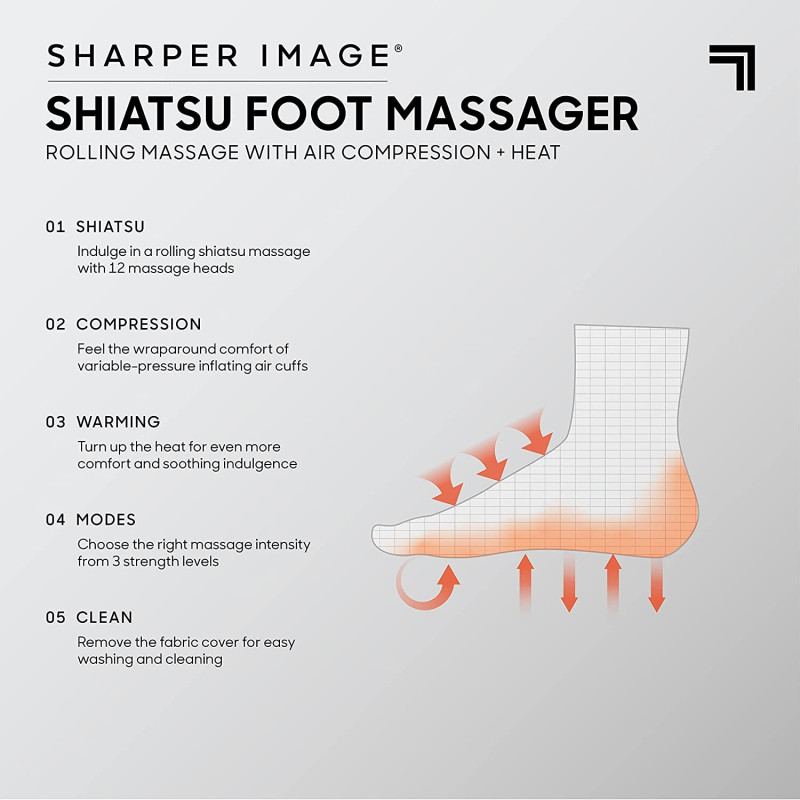 • SOOTHE ACHY FEET: Take a load off with the Sharper Image Heated Shiatsu Massager! This soft and cozy device uses heat and vibration to relax your sore toes and feet for relief after a long day.