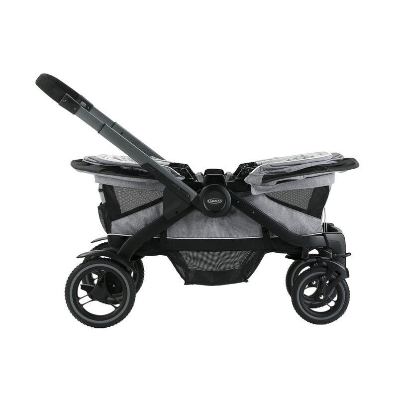Ready for adventures big and small, it's the comfy, cozy, versatile Graco Modes Adventure Stroller Wagon. A small, compact fold—one of the smallest in the market—ensures easy storage and transportation. Because comfort is key, there are 2 plush seats and a footwell for little legs and feet to rest in this kids wagon. Pull it like a wagon or push it like a stroller; it easily converts from one to the other. All-terrain rubber tires with suspension let you go wherever the fun is. Plus, this folding wagon stroller accepts any Graco infant car seat with an adapter (sold separately), so even your infant can come along for the ride from day 1. More features include a child's tray with cup holders, a lightweight aluminum frame, height-adjustable handle, and 2 large canopies with breathable mesh panels and UV 50 sun protection. Our sturdy toddler wagon holds up to 22.5 kg (50 lb) per seat, or 45 kg (100 lb) total. Use it as a beach wagon or take it to the park, this all-terrain wagon makes it easy.