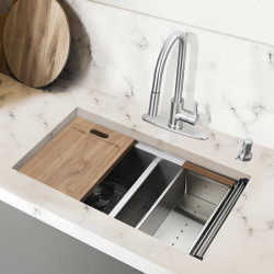 Workstation sink with integrated ledge that allows the included accessories to slide across without sacrificing counter space