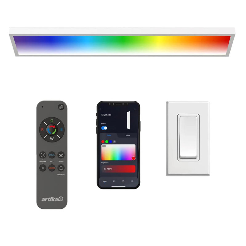 Ultra-powerful with 4,000 lumens, this panel measures approximately 30 inches long and can be controlled by a wall switch, a remote control (included), or an app. Lighting options include different shades of white, RGB colours, presets, and music synchronization. Limited warranty of 5 years. Lifespan: 50,000 hours.