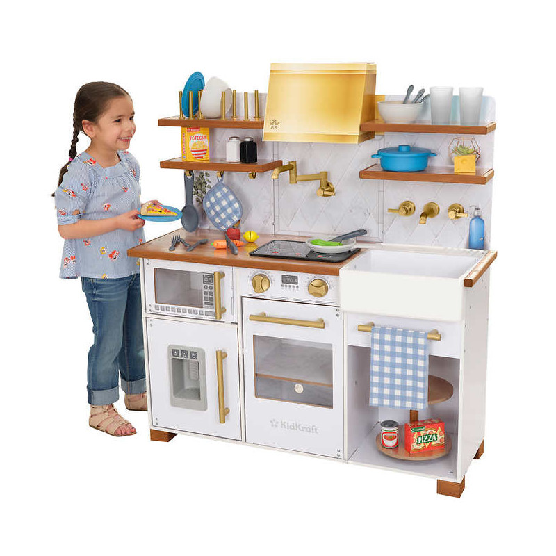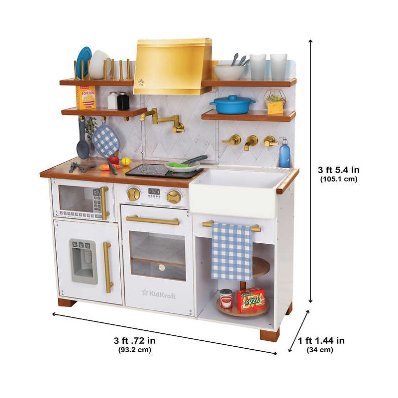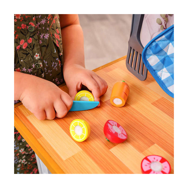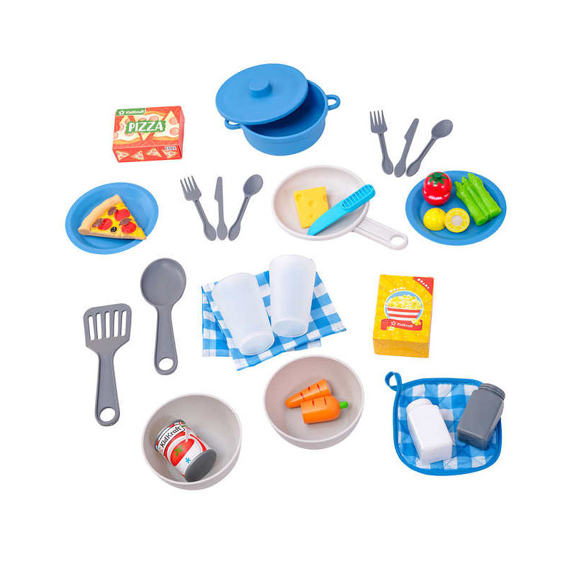 30+ accessories including three choppable foods, pot, pan, dishware, utensils, potholder, towel and grocery items